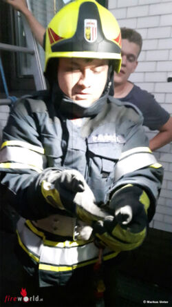Das Tier hing dort fest. Über eine Leiter konnte sich ein Feuerwehrmann dem verfangenen Vieh nähern und es aus der Notlage befreien. Es wird von der Tochter eines der beteiligten Feuerwehrleute morgen früh, 29. Juni, zum Tierarzt gebracht, da es eine Verletzung im Flügelbereich aufweist. Für die Feuerwehr ging der Tierrettungseinsatz rasch zu Ende.