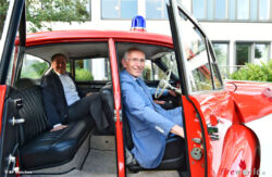 Nachdem er ein letztes Mal sein Haus von oben inspiziert hatte stieg er um in einen echten Oldtimer. Der Einsatzleitwagen BMW, V8 – auch bekannt als „Barrockengel“ – brachte Dr. Blume-Beyerle, eskortiert von einer Kradmelderstaffel der Freiwilligen Feuerwehr, nach Hause.