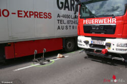 "Wir sind alarmiert worden zu einer Personenrettung. Person unter einem Lkw am Marktplatz in Lambach. Bei unserem Eintreffen hat sich das dargestellt, dass diese Person unter dem Lkw noch eingeklemmt war. Wir haben mittels Hebekissen den Lkw angehoben und haben zur Bergung des Verunglückten dann beigetragen," schildert Johannes Moser, Einsatzleiter der Feuerwehr Lambach.