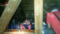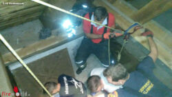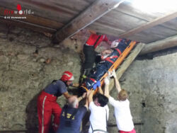 Das Notarztteam stabilisierte den Patienten und bereitete die Rettung vor. Der Einsatzleiter beorderte die Höhenrettungsgruppe der FF Vöcklabruck zum Einsatzort, welche die Personenrettung übernahm. Der Aufbau der Seilsicherung gestaltete sich aufgrund der sehr engen Platzverhältnisse äußerst schwierig. Der in die Korbschleiftrage gebettete Verletzte konnte so Etage für Etage über die schmalen Treppen nach unten befördert werden. Nach eineinhalb Stunden schweißtreibender Arbeit verbrachte das Rote Kreuz den Verletzten ins Krankenhaus.