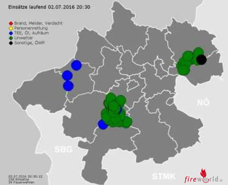 Oö: Schweres Gewitter im Raum Laakirchen, Bad Wimsbach und Mühlviertel am 2. Juli 2016 → Viele Wehren in Oö im Einsatz
