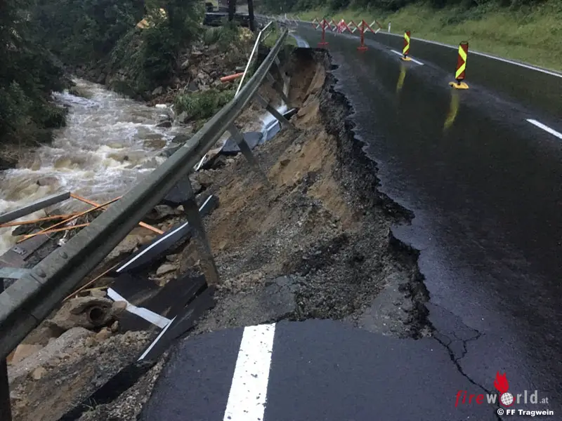 Die B124 ist Richtung Bad Zell ab Kreuzung Tragwein bis auf Widerruf komplett gesperrt und eine großräumige Umleitung über Erdleiten ist eingerichtet, da die Straße teils schwer beschädigt und unmöglich passierbar ist. Feuerwehr, Polizei und Straßenmeisterei stehen im Einsatz.