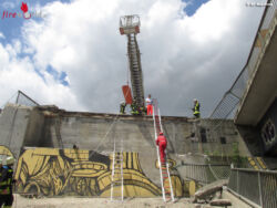 Als Erstmaßnahme wurde die Zugänglichkeit an die Patienten über tragbare Leitern sichergestellt. Die Rettungskräfte übernahmen an der Einsatzstelle sofort die Erstversorgung der beiden Bauarbeiter, und bereiteten die technische Rettung der Patienten mittels Flaschenzug in Verbindung von Höhenrettung und der Drehleiter vor.