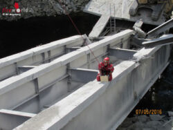 AUGSBURG (BAYERN): Kurz vor 12 Uhr des 5. Juli 2016 wurden die Berufsfeuerwehr Augsburg und weitere Rettungskräfte zur Behelfsbrücke über die Wertach an der Ackermannstraße gerufen. Die Brücke war auf gesamter Länge eingebrochen.