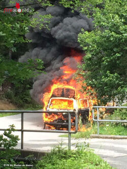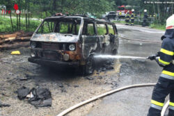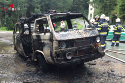 Am Einsatzort angelangt stand der Campingbus bereits im Vollbrand und der Fahrzeugbesitzer warnte die Kameraden gleich, dass sich Gasflaschen im Auto befinden.