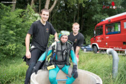 Ganz unscheinbar auf einer Wiese unweit eines Bauernhofes, nur mit einem Hinweisschild „100 m3 Löschwasserstelle" gekennzeichnet, haben die Taucher die Tauchübung durchgeführt. In Zweiergruppen stiegen die Froschmänner in den rund drei Meter tiefen Löschwasserbehälter ein um nach einer vermissten Person (Übungspuppe) zu tauchen.