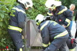 Wenige Minuten danach trafen vier vollbesetzte Fahrzeuge an der Einsatzstelle ein. Die Mannschaft des Vorausfahrzeuges unternahm sofort Maßnahmen zur Öffnung der Metalltür. Nach wenigen Augenblicken konnte die Tür, mittels hydraulischem Akku-Kombigerät, deformiert und entriegelt werden.