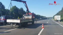 Beim Eintreffen des ersten Fahrzeuges waren die verletzten Personen bereits in umliegende Krankenhäuser abtransportiert worden. Daher beschränkten sich die Tätigkeiten auf die Fahrzeugbergung des PKW welcher auf dem dritten Fahrstreifen an der Mittelbetonleitwand zu stehen kam. Dieser wurde mittels Ladekran des LAST-Fahrzeuges verladen und von der Autobahn verbracht. Der beteiligte LKW konnte seine Fahrt selbstständig fortsetzen.