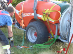 Aus unbekannter Ursache stürzte in einem Weingarten am Hohenberg zwischen Großweikersdorf und Ruppersthal der Spritzenanhänger eines Traktorgespanns um. Da es dem Weinbauern mit eigenen Mitteln nicht möglich war den Anhänger wieder aufzurichten, rief er die Einsatzkräfte der Feuerwehr zu Hilfe. Vor Ort eingetroffen wurde unter Zuhilfenahme des hydraulischen Spreizers eine entsprungene Feder wieder montiert. Mittels Seilwinde des Rüstlöschfahzeuges wurde der Anhänger wieder aufgerichtet, während er mit dem Kran des Wechselladefahrzeuges gegengesichert wurde. Anschließend konnte wieder ins Feuerwehrhaus eingerückt werden.