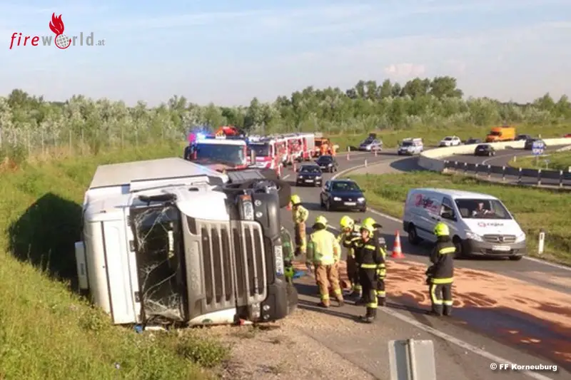 KORNEUBURG (NÖ): Um 06.03 Uhr des 11. Juli 2016 alarmierte der Disponent der Bezirksalarmzentrale Stockerau die Freiwillige Feuerwehr der Stadt Korneuburg zu einem Lkw-Unfall mit einem Pkw auf der Schnellestraße S1.
