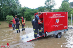 Am heftigsten betraf es das Triestingtal und da vor allem den Großraum um Hernstein und Aigen. Mehre Feuerwehren standen hier über Stunden im Dauereinsatz. Den wohl spektakulärsten Einsatz am gestrigen Tag, gab es in Hernstein. Durch den plötzlich auftretenden Starkregen traten diverse Bäche und Gerinne im Ortsgebiet von Aigen und Hernstein über die Ufer. Der Boden konnte die Wassermassen nicht in dem Ausmaß aufnehmen, in der sie vom Himmel fielen. Das Wasser suchte sich seinen Weg über Felder, Wiesen und auch die Fahrbahn in das Tal war an vielen Stellen überschwemmt und nur schwer passierbar.