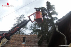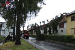 Ein weiterer Einsatz wird mit Stand von 21 Uhr noch in der Grazerstraße abgearbeitet, wo ebenfalls ein Baum umstürzte und der Wipfel auf ein Hausdach ragt. Die Feuerwehr Mureck stand zur genannten Zeit mit dem Schweren Rüstfahrzeug (SRF), Tanklöschfahrzeug (TLFA2000) sowie Mannschaftstransportfahrzeug (MTF) und 16 Kräften im Einsatz.
