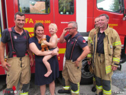 Auch die intensiven Bemühungen der Mutter blieben vergeblich, weshalb die Frau die Berufsfeuerwehr zur Hilfe rief. Innerhalb weniger Augenblicke konnte Arthur (3 Jahre) unverletzt aus seiner misslichen Lage befreit und an seine Mutter übergeben werden. Während der gesamten Rettungsaktion, die nur kurze Augenblicke dauerte, war Arthur sehr ruhig und tapfer. Im Anschluss wurde noch am Feuerwehrfahrzeug Platz genommen sowie Traumabär Flo übergeben.