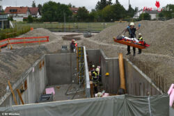 Da die Rettung aus dem Keller mit den Mitteln des anwesenden Rettungsdienstes nicht möglich war, alarmierte die Besatzung die Feuerwehr nach. Nach weiteren Stabilisierungsmaßnahmen wurde der Mann mit Hilfe des Baustellenkranes liegend in einer Schleifkorbtrage nach oben gezogen und von einem Kollegen betreut. Abschließend transportierte ihn der Rettungsdienst mit Notarztbegleitung in den Schockraum einer Klinik.