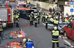 Einsatzkräfte der Feuerwehr München sicherten sofort die Einsatzstelle, während die Mitarbeiter des Rettungsdienstes und ein Notarzt die Verletzte, im silbernen Fahrzeug, versorgten.