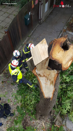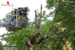 In der Ferdinandsgasse hatte der Sturm Teile von einem Alleebaum abgebrochen – nachdem sichtbar geworden war, dass das Innenleben des Baumes schon morsch und zersetzt war, wurde die restliche Baumkrone von der Feuerwehr entfernt. Zwei Feuerwehrleute schnitten die Äste vom Korb der Drehleiter aus mit einer Motorsäge ab.