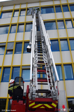 An einem Bürogebäude an der B17 drohte eine lose Jalousie abzustürzen – sie musste von der Feuerwehr per Drehleiter entfernt werden (Video unten).