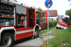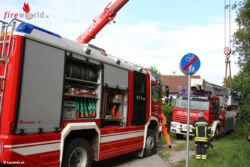 Durch die starken Regenfälle der vergangenen Tage war der Zufahrtsweg zur Einsatzörtlichkeit offenbar starkt aufgeweicht worden und die Teleskopmastbühne der Feuerwehr sank auf einer Seite ein.