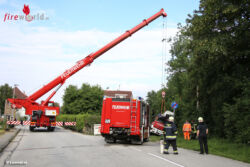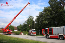 STADL PAURA (OÖ): Bei einem Tierrettungseinsatz in Stadl-Paura (Bezirk Wels-Land) ist Freitagfrüh, 15. Juli 2016, die Teleskopmastbühne der Feuerwehr auf einem aufgeweichten Zufahrtsweg eingesunken. Die örtliche Feuerwehr war alarmiert worden, um eine Katze – welche laut Anruferin nicht mehr von selbst vom Baum konnte – zu retten.
