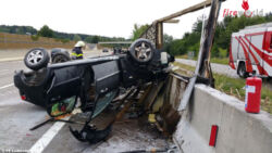 Der Lenker eines Pkw kam aus bisher ungeklärter Ursache ins Schleudern, kam von der Fahrbahn ab, rammte die Lärmschutzwand, überschlug sich mehrmals und fing Feuer. Durch das rasche Eingreifen der Feuerwehr konnte ein vollständiger Brand verhindert werden. Die verunfallte Person konnte sich selbst aus dem Wrack retten.