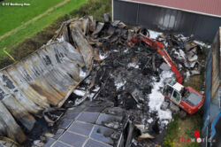 Zuletzt setzte die Feuerwehr Bagger ein, um die niedergebrannte Halle einzureißen, um so besser an letzte Glutnester heranzukommen.