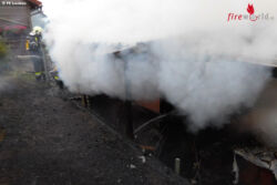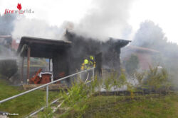 Innerhalb kürzester Zeit rückten die Feuerwehren zu diesem Brandereignis aus. Bereits an der Anfahrt zur Einsatzstelle war eine starke Rauchentwicklung zu sehen. Bei der Erkundung der ersteingetroffenen Einsatzkräfte stellte sich heraus, dass es zu einem Vollbrand einer Gartenhütte gekommen war und dass sich eventuell noch Personen in der Gartenhütte aufhielten.