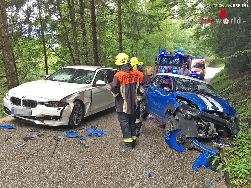 SCHÖNAU AM KÖNIGSSEE (BAYERN): Gegen 11.30 Uhr hat sich am 18. Juli 2016 auf der Vorderbrandstraße unterhalb des Gasthauses ein Verkehrsunfall mit zwei Autos ereignet, bei dem insgesamt drei Beteiligte verletzt wurden. Ein 3er-BMW aus dem Main-Kinzig-Kreis (Hessen) und ein 17-jähriger Einheimischer mit seinem M8-Microcar waren zusammengestoßen.