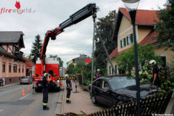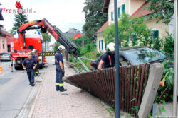 Das Fahrzeug wurde mittels des SRF-Krans aus dem Garten gehoben. Fahrzeugteile wurden eingesammelt, Zaunteile wurden wieder am Grundstück abgelegt. Danach wurde der schwer beschädigte Pkw auf der Straße abgestellt, von wo aus es ein benachrichtigtes Abschleppunternehmen abtransportierte. Die Straße wurde für die Dauer der Bergung einseitig gesperrt.