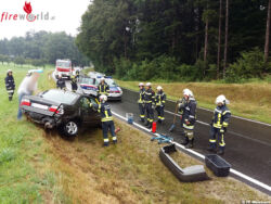 Der seitlich liegende Nissan wurde mit Muskelkraft auf die Räder gestellt. Anschließend wurde der Pkw mit der Seilwinde des RLFA 2000 auf die Straße gezogen. Die beiden beteiligten Fahrzeuge wurden auf eine nahe gelegene Abstellfläche geschoben. Nach der Fahrbahnreinigung konnte der Einsatz um 15:00 Uhr beendet werden.