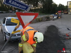 SEEHAM (SBG): Die Feuerwehr Seeham wurde am 21. Juli 2016 um 04:55 Uhr zu einer Ölspur auf der L207 ,höhe Gewerbegebiet Kälberpoint, alarmiert. Ein unbekannter Fahrzeuglenker, kam mit seinem Fahrzeug von der Landesstraße ab und fuhr auf einen Gehsteig auf und rammte dabei ein Verkehrsschild, welches sich unter dem Fahrzeug verkeilte.