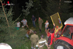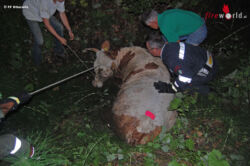 Beim Eintreffen der Feuerwehr, die mit 17 Mann ausgerückt war, wurde folgende Lage vor-gefunden: Eine Kalbin war mitten in einem dicht bewachsenen Waldstück, in unwegsamem und sehr steilem Gelände, in einen sumpfigen Graben geraten. Dort war sie bis zum Bauch eingesunken und konnte sich nicht ohne weitere Hilfe aus ihrer Lage befreien. Herausfor-dernd war der aufgeweichte und feuchte Untergrund auch für die Einsatzkräfte, da kein na-hes Herankommen mit Fahrzeugen an die Einsatzstelle möglich war.