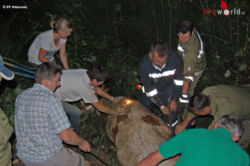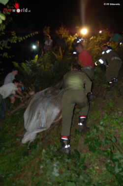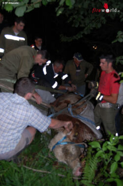 Die nächtliche Rettung aus diesem rund 25 Meter tiefen und nahezu senkrechten Graben bei rund 100 % Steigung gestaltete sich extrem schwierig. Erst mithilfe einer Traktorseilwinde, Gurten, Rundschlingen und umfunktionierten Dünger-Big-Bags gelang es mit vereinten Man-neskräften, die schwer erschöpfte Kalbin aus dem Gefahrenbereich zu befreien und über den steilen Abhang hinauf zu ziehen.