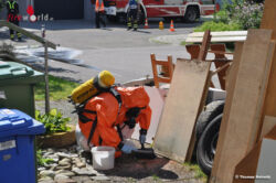 Er konnte ebenfalls keine 100% Aussage über den Stoff treffen und empfahl dem Einsatzleiter, den Stoff mit der nötigen Sorgfalt und Schutzausrüstung aufzunehmen und in ein Behältnis zu verbringen. So wurde letztendlich der Stoff von einer Einsatzkraft ausgerüstet mit einem leichten Chemieschutzanzug und Atemschutz in einem Behälter Zusammengefasst. Dieser Behälter wurde im Anschluss über den örtlichen Bauhof zur Sonderentsorgung zugeführt.