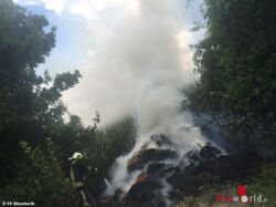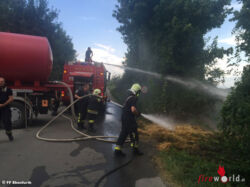 Dieser hatte sich bereits auf die umliegenden Bäume und auf das dahinter liegende Maisfeld ausgebreitet. Mittels drei Löschleitungen von Tank 1 und Tank 2 konnte der Brand schnell eingedämmt werden und ein weiteres Ausbreiten somit verhindert werden. Nach dem Zerteilen des Strohs wurden die Nachlöscharbeiten mittels Wasserwerfer durchgeführt und die Brandstelle mit der Wärmebildkammera nachkontrolliert. Die Wasserversorgung wurde vom WLF-Tank 9000 sichergestellt.