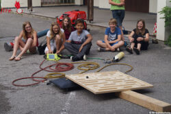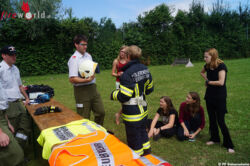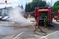 Natürlich durfte die Ausrüstung der Feuerwehr nicht fehlen und so konnten jeder die Gerätschaften und diverse Schutzanzüge der Fahrzeuge erkunden und ausprobieren. Bei Geschicklichkeitsübungen wie z.B.: eine Kugel nur durch findiges Ansteuern zweier Hebekissen durch ein Labyrinth zu befördern stellten die Jugendlichen ihr Feingefühl unter Beweis und der Sportsgeist wurde bei einem kleinen Hindernisparcours mit Zielspritzen gefordert.