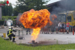 So wurde z.B.: in vielen kleinen Experimenten die Brennbarkeit verschiedener Stoffe inklusive einer Staubexplosion demonstriert und auf die Gefahren von Pyrotechnik oder Grillanzünd-Hilfen aufmerksam gemacht. Was passiert wenn man einen Fettbrand mit Wasser löscht wurde eindrucksvoll gezeigt und die Kameraden gingen auch auf das Thema Brandrauch in Kombination mit der Funktion und dem Nutzen von Brandmeldern ein.