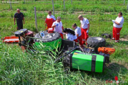 Ein Traktor war etwa 4 Meter eine Böschung abgestürzt und kam seitlich im Weingarten zu liegen. Der verletzte Fahrer war glücklicherweise nicht unter seinem Arbeitsgerät eingeklemmt. Von der Feuerwehr wurde zu Beginn die Rettungswanne (Korbschleiftrage) sowie ein Spineboard für den Abtransport des Verletzten vorbereitet und mit Steckleiterteilen eine sichere Zugangsmöglichkeit über die Böschung geschaffen.