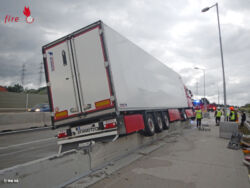 WIEN: Aus ungeklärter Ursache war kurz nach 19.00 Uhr des 31. Juli 2016 ein Sattelzug im Baustellenbereich km 5.2 der A4 „Ost-Autobahn“ mit der rechten Fahrzeugseite auf die Betonleitwand aufgefahren.