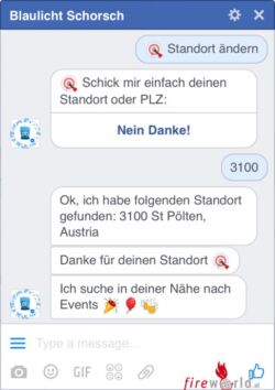 eine Chat-Nachricht. Gibt man den Ort oder die Postleitzahl des gewünschten Zielortes an, werden in Sekundenschnelle die Events in der Nähe angegeben. Dazu wird ebenso die Eventseite, sowie der Routenplaner angeführt. Wird ein Feuerwehrfest im Messenger Bot noch nicht gelistet, gibt es die Möglichkeit eigene Events per Formular hinzuzufügen.Chat-Bots als alltägliche Helfer