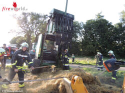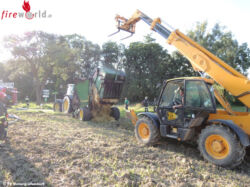Um die Presse ausräumen zu können, wurde sie in ein angrenzendes Feld geschoben und unter Zuhilfenahme eines Teleskopladers geöffnet. Der sich in der Rundballenpresse befundene Ballen konnte so aus der Presse fallen. Das Stroh wurde am Feld abgelöscht.