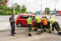 Die ausgerückte Mannschaft baute mittels Kanthölzer eine Rampe und konnte gemeinsam mit der Besatzung des vom TUS-Alarm rückkehrenden Fahrzeuges den Kleinwagen wieder zurück auf die Straße schieben.