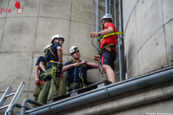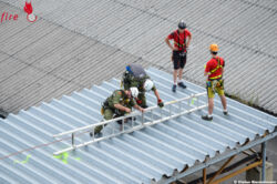 Dabei lag das Augenmerk am richtigen Anseilen zwischen den Kameraden im Trupp. Dies wird im Feuerwehrdienst zum Beispiel beim Abschaufeln von schneebedeckten Dächern angewandt. Um den Parcours über die Gebäude absolvieren zu können, mussten von den Übungsteilnehmern mehrere Höhenunterschiede auf sichere Weise überwunden werden. Hierzu wurden von den MRAS-Trupps diverse Leitern und Abseiltechniken eingesetzt.