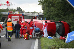 WELS (OÖ): Zusammen mit dem Roten Kreuz wurde die Feuerwehr Wels am Samstagmorgen, den 6. August 2016, zu einem Verkehrsunfall mit eingeklemmten Personen auf der Welser Autobahn A 25 im Bereich der Abfahrt Wels–Ost alarmiert.