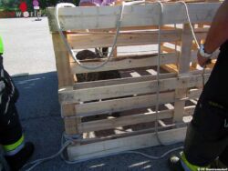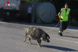 Dies erwies sich als keine leichte Aufgabe, aber mit Hilfe von Einsatzfahrzeugen und ausreichend Mannschaft konnte das Tier dann in eine Ecke getrieben und dort durch OFM Alexander Glatz, der zwar beruflich eher mit Stieren vertraut ist, mit einer Leine eingefangen werden. Kurzerhand wurde mit Holzpaletten ein Verschlag gebaut und so ein provisorischer Schweinestall errichtet. Das Tier wurde mit Wasser bis zum Eintreffen des Besitzers von den Einsatzkräften versorgt.