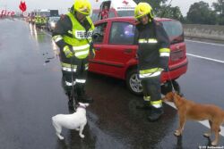 Bis jetzt war alles Routine, aber die Rettung der beiden Hunde gestaltet sich jedoch ein wenig schwierig. Den Feuerwehreinsatzkräften gelang es schließlich erst nach einigen Minuten die beiden verstörten Hunde im verunfallten Fahrzeug einzufangen. Nach telefonischer Rücksprache mit einem Tierarzt wurden die Tiere zwecks Erstversorgung zur ortsansässigen Tierklink nach Landegg gebracht und dort behandelt.