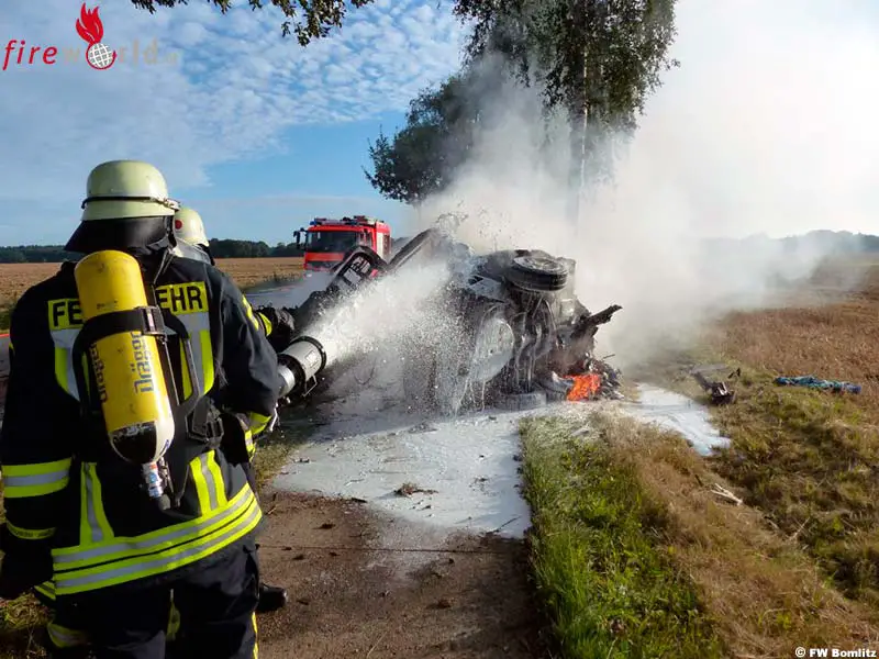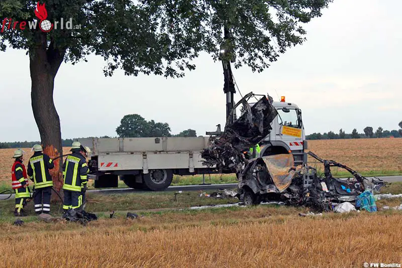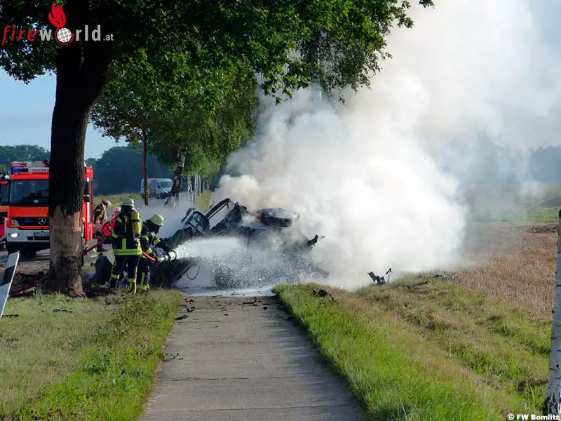 BOMLITZ (D): Zu einem tödlichen Verkehrsunfall wurde die Freiwillige Feuerwehr Bomlitz am Morgen des 11. August 2016 um 7.26 Uhr alarmiert. Auf der Kreistraße 129 zwischen dem Vogelpark und Benefeld war ein Pkw von der Straße abgekommen, mit einem Baum kollidiert und anschließend in Brand geraten.