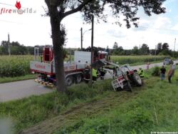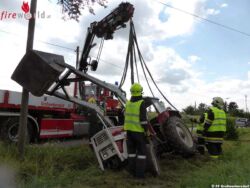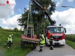 Mittels Kran des Wechselladefahrzeuges wurde der Traktor geborgen und konnte seine Fahrt fortsetzen. Die Feuerwehr Großweikersdorf stand mit neun Mitgliedern und drei Fahrzeugen (Rüstlösch-, Rüst- und Wechselladefahrzeug) für ca. eine Stunde im Einsatz