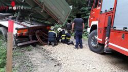 LEOBEN (STMK): Am 11. August 2016, um 11.26 Uhr, alarmierte die Bereichsfunkleitstelle Florian Leoben die Freiwillige Feuerwehr Leoben-Stadt und die Freiwillige Feuerwehr Leoben-Göß mit dem Alarmstichwort „T03-VU-Berg.-Öl“ Lkw-Bergung im Schladnitzgraben.