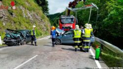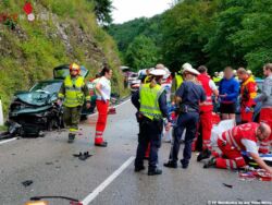 Beim Eintreffen an der Unfallstelle war das Rote Kreuz mit einem Großaufgebot von Fahrzeugen bereits vor Ort. Aus bisher noch ungeklärter Ursache prallten zwei Pkws frontal aneinander. Durch die Wucht des Aufpralls wurden vier Personen schwer-bzw. leichtverletzt. In Absprache der Einsatzleiter vom Roten Kreuz und der Feuerwehr wurde die weitere gemeinsame Vorgangsweise abgestimmt.