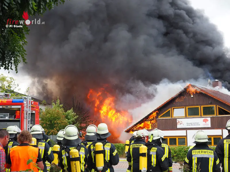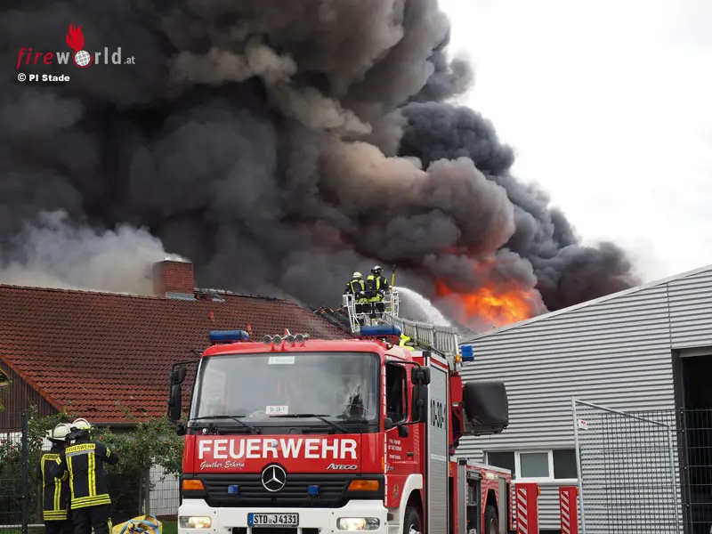 Die Feuerwehren begannen sofort mit den Löscharbeiten, konnten aber eine weitere Ausbreitung in dem zuerst betroffenen Brandobjekt (einem Gewerbebetrieb, der Lacke auf Naturbasis herstellt) nicht verhindern. Die Flammen schlugen aus dem Dach, die Hitzeentwicklung war enorm. Schwarze Rauschschwaden stiegen zum Himmel, die im ca. 25 Kilometer entfernten Stade noch überdeutlich zu erkennen waren.